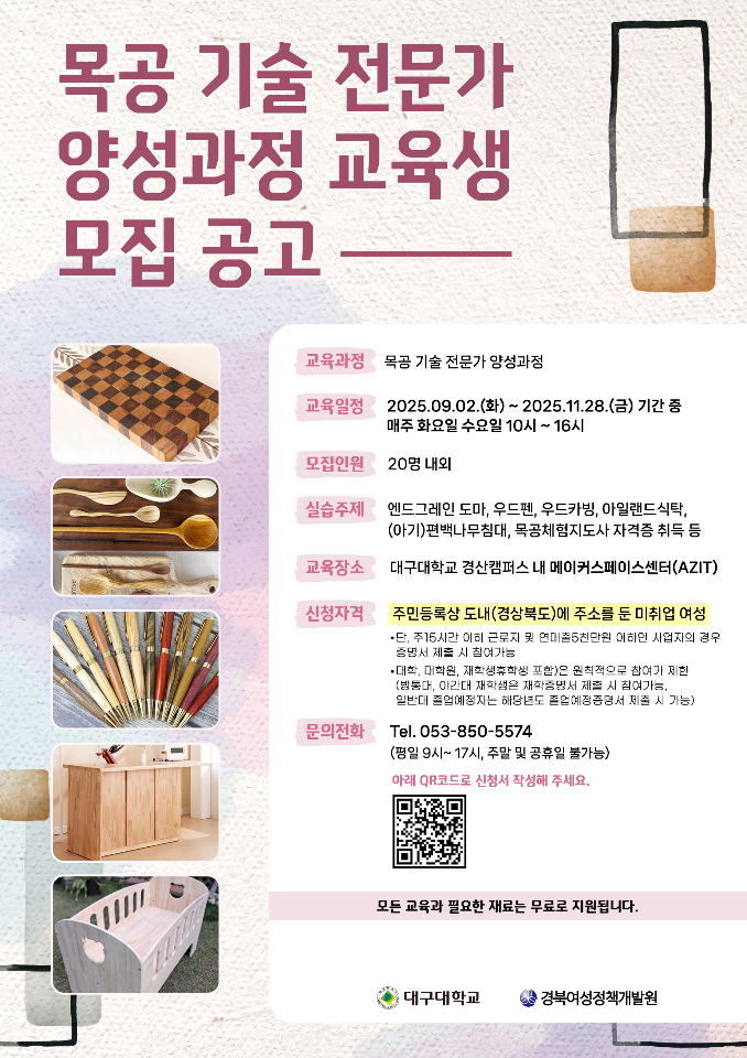 지역산업기반 전문인력 양성과정-목공 기술 전문가 양성과정 교육생 모집!