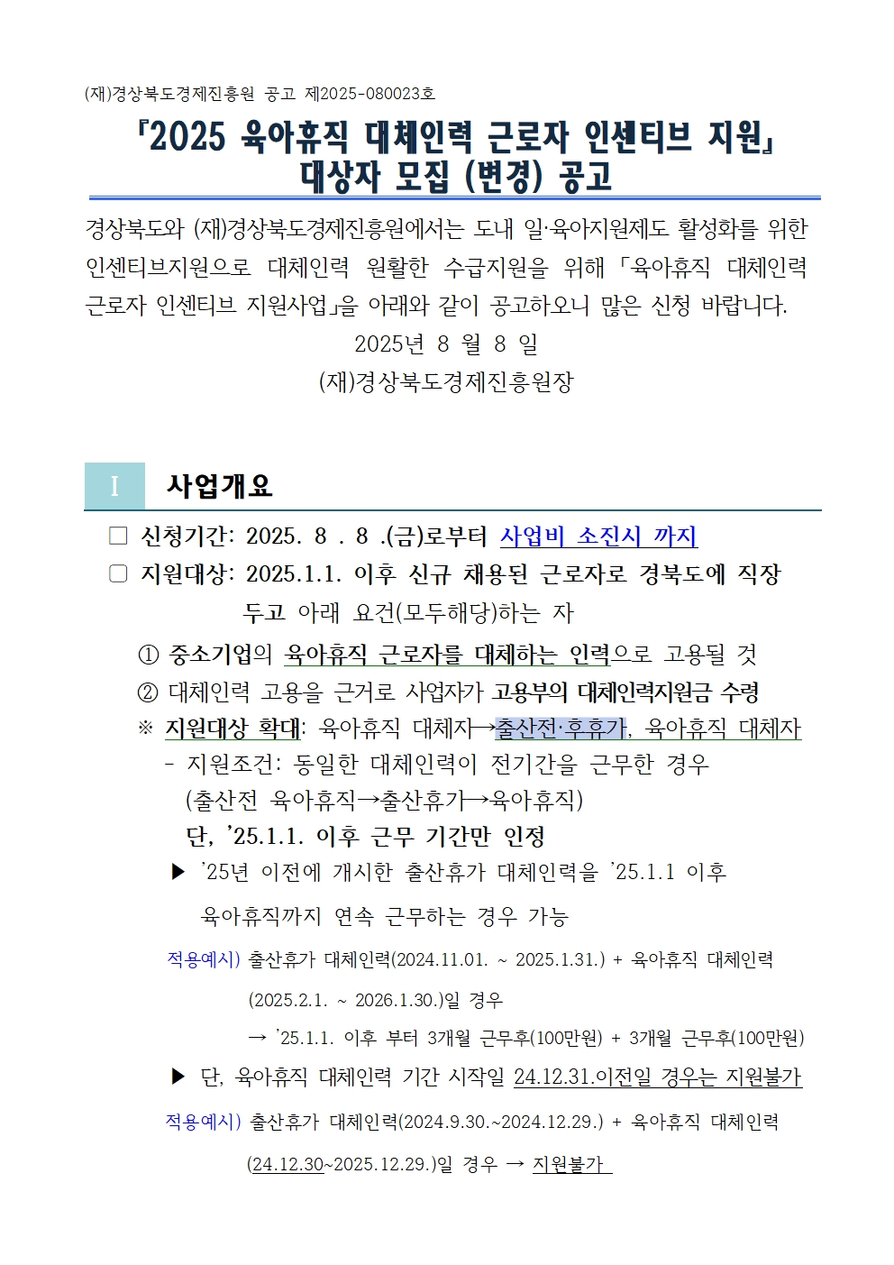 「2025 육아휴직 대체인력 근로자 인센티브 지원사업」 지원대상 기간 (변경) 공고